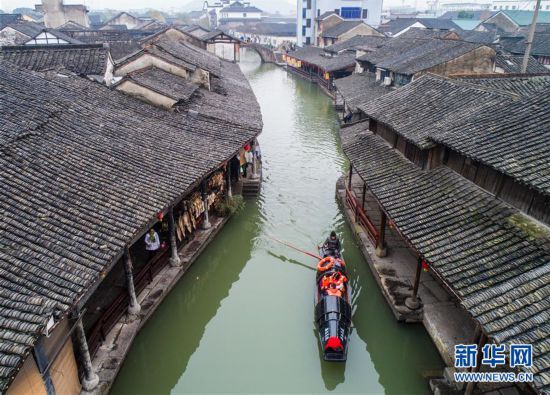 1月6日,游客乘坐傳統(tǒng)烏篷船游覽安昌古鎮(zhèn)(無(wú)人機(jī)拍攝)。 新華社記者 徐昱/攝