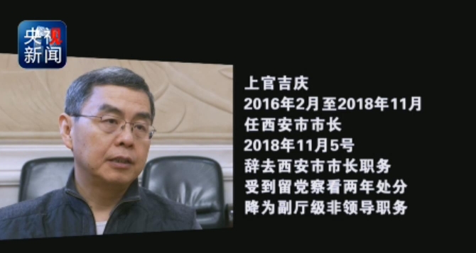 上官吉慶,2016年2月至2018年11月任西安市市長,2018年11月5號辭去西安市市長職務(wù),受到留黨察看兩年處分,降為副廳級非領(lǐng)導(dǎo)職務(wù)。