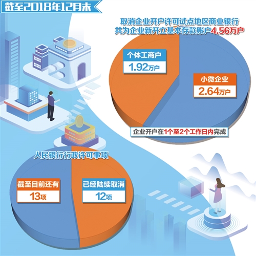 取消企業(yè)開戶許可將在2019年先行試點(diǎn),并于年底前完全取消全國范圍內(nèi)的企業(yè)開戶許可。2018年6月11日起,央行已經(jīng)在江蘇泰州、浙江臺州先行試點(diǎn)取消企業(yè)銀行賬戶開戶許可。范一飛介紹,目前,試點(diǎn)工作總體平穩(wěn),社會反響良好。截至2018年12月末,試點(diǎn)地區(qū)商業(yè)銀行共為企業(yè)新開立基本存款賬戶4.56萬戶,其中小微企業(yè)2.64萬戶、個體工商戶1.92萬戶,企業(yè)開戶在1個至2個工作日內(nèi)完成。
