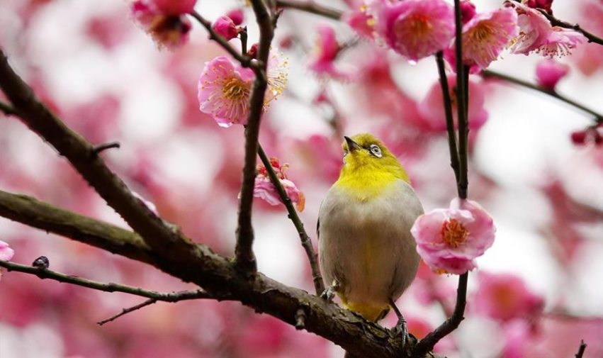 1月9日,在貴陽(yáng)市南明河畔,一只小鳥(niǎo)被盛開(kāi)的梅花吸引。 新華社發(fā) 秦剛/攝