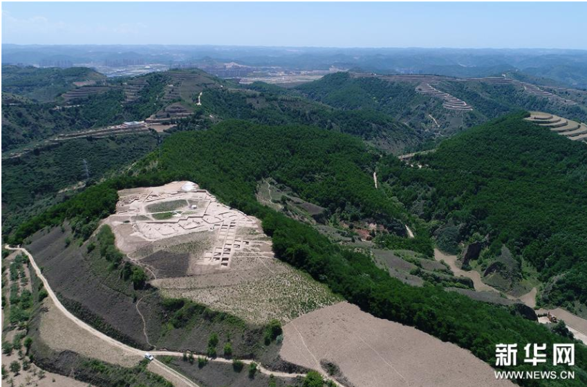 陜西延安市蘆山峁新石器時代遺址地貌與發(fā)掘區(qū)遠(yuǎn)景(資料照片)。?