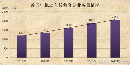 汽車轉(zhuǎn)移登記業(yè)務(wù)量持續(xù)增長(zhǎng),二手車交易市場(chǎng)日益活躍。2018年,全國(guó)共辦理機(jī)動(dòng)車轉(zhuǎn)移登記2128萬筆,其中汽車轉(zhuǎn)移登記2058萬筆,占96.72%,比2017年增加177萬筆,增長(zhǎng)9.44%。從統(tǒng)計(jì)情況看,近五年汽車轉(zhuǎn)移登記與注冊(cè)登記業(yè)務(wù)量的比例由0.55上升至0.77,反映出二手車交易市場(chǎng)日益活躍。
