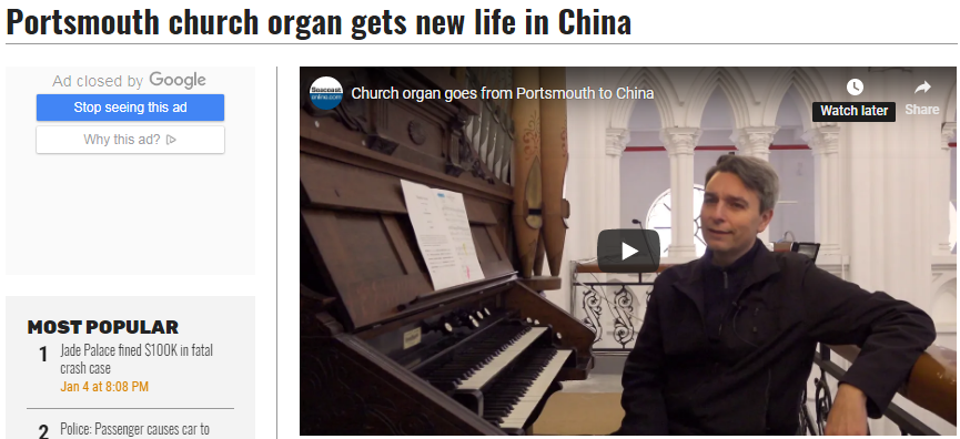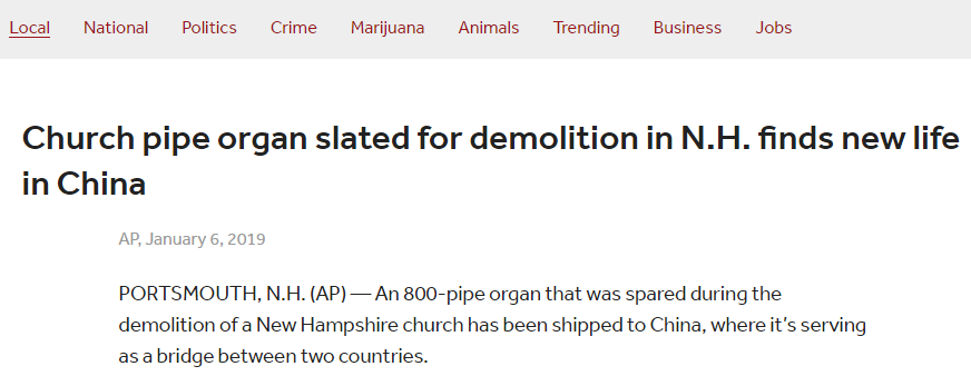 美國seacoastonline新聞網(wǎng)站報道稱 2017年12月,伯格在網(wǎng)上看到了一則管風琴出售的廣告,后來對方將這架管風琴免費送給了寧波?!拔ㄒ坏臈l件是要在三周內(nèi)將琴從教堂拆走。伯格需要趕快尋找一位經(jīng)驗豐富的管風琴建造師,盡快完成拆卸,并將琴從美國運走?!?/p>