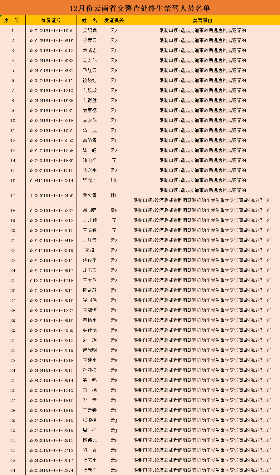 附:2018年12月份云南省公安交警查處終生禁駕人員名單