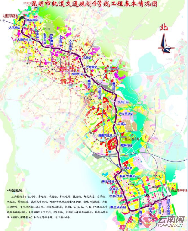 昆明地鐵4號(hào)線北端起于陳家營(yíng)站,南端止于昆明火車南站,串聯(lián)了主城西北的國(guó)家高新技術(shù)產(chǎn)業(yè)開發(fā)區(qū)、主城中心區(qū)、主城東南的國(guó)家經(jīng)濟(jì)技術(shù)開發(fā)區(qū),并向南連接呈貢新城。