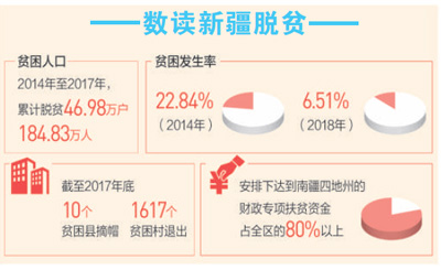 黨的十八大以來,新疆維吾爾自治區(qū)認真貫徹落實習(xí)近平總書記關(guān)于扶貧工作的重要論述,把打好精準脫貧攻堅戰(zhàn)作為推動黨中央治疆方略落地生根、實現(xiàn)新疆社會穩(wěn)定和長治久安總目標的關(guān)鍵舉措,走出了一條具有新疆特色的脫貧攻堅之路。確定南疆四地州22個深度貧困縣及所轄192個深度貧困鄉(xiāng)鎮(zhèn)、1962個深度貧困村和162.75萬貧困人口,將其作為脫貧攻堅的重中之重、堅中之堅。大力實施特色產(chǎn)業(yè)帶動、轉(zhuǎn)移就業(yè)、易地扶貧搬遷、突破瓶頸制約等8個專項行動;圍繞新疆社會穩(wěn)定和長治久安,實施邊境扶貧、基層基礎(chǔ)建設(shè)兩個專項行動。發(fā)揮貧困群眾主體作用,常態(tài)化開展感恩教育、民族團結(jié)聯(lián)誼等活動,深入推進“去極端化”教育,破除“等靠要”思想。