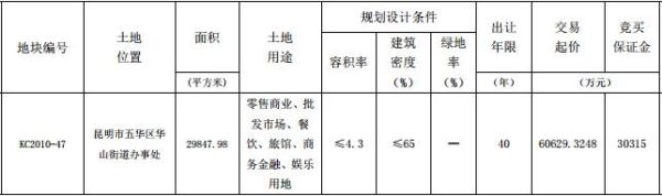 根據(jù)昆明市國(guó)土局公告,五華區(qū)華山街道原昆八中地塊編號(hào)KC2010-47,面積約44.76畝,土地用途為零售商業(yè)、批發(fā)市場(chǎng)、餐飲、旅館、商務(wù)金融、娛樂用地,容積率4.3,交易起價(jià)60629.3248萬(wàn)元,土地單價(jià)約1354萬(wàn)元/畝,樓面價(jià)約4724元/平米,將于下月20日網(wǎng)上掛牌交易。