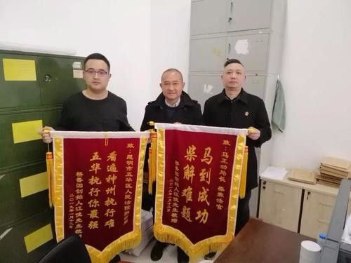 1月14日上午,弟弟來到昆明市五華法院,將兩面錦旗送到了執(zhí)行干警柴霖手里,錦旗上寫著:“看遍神州執(zhí)行難,五華執(zhí)行你最強(qiáng)。馬到成功,柴解難題?!?/p>