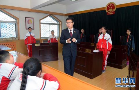2017年12月4日,在河北省石家莊市建勝路小學(xué)舉辦的校園模擬法庭現(xiàn)場(chǎng),石家莊市橋西區(qū)檢察院檢察官為學(xué)生們講解庭審程序。來源:新華社
