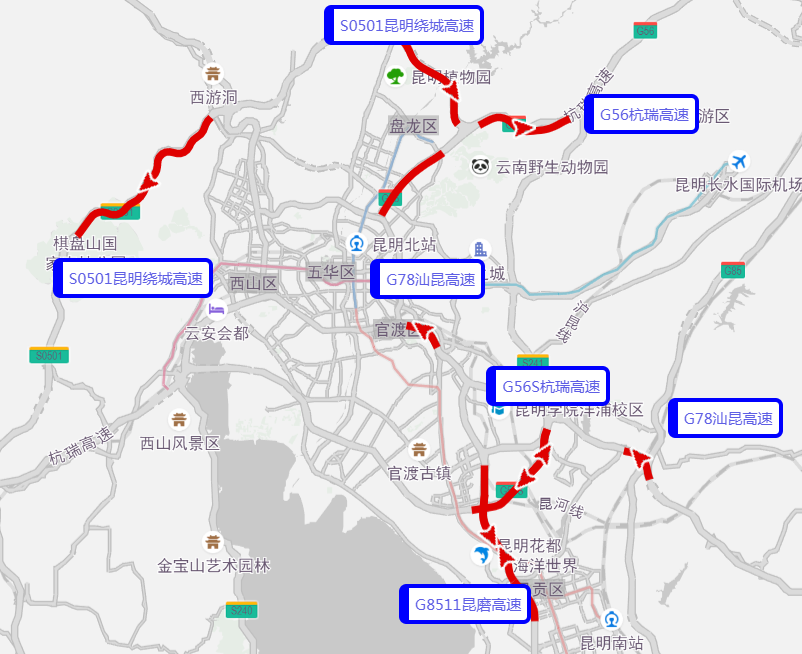 S0501昆明繞城高速(茨壩路出入口-G56杭瑞高速入口方向路段)1月26日14:00~ 22:00易擁堵,預計擁堵時長9小時;
