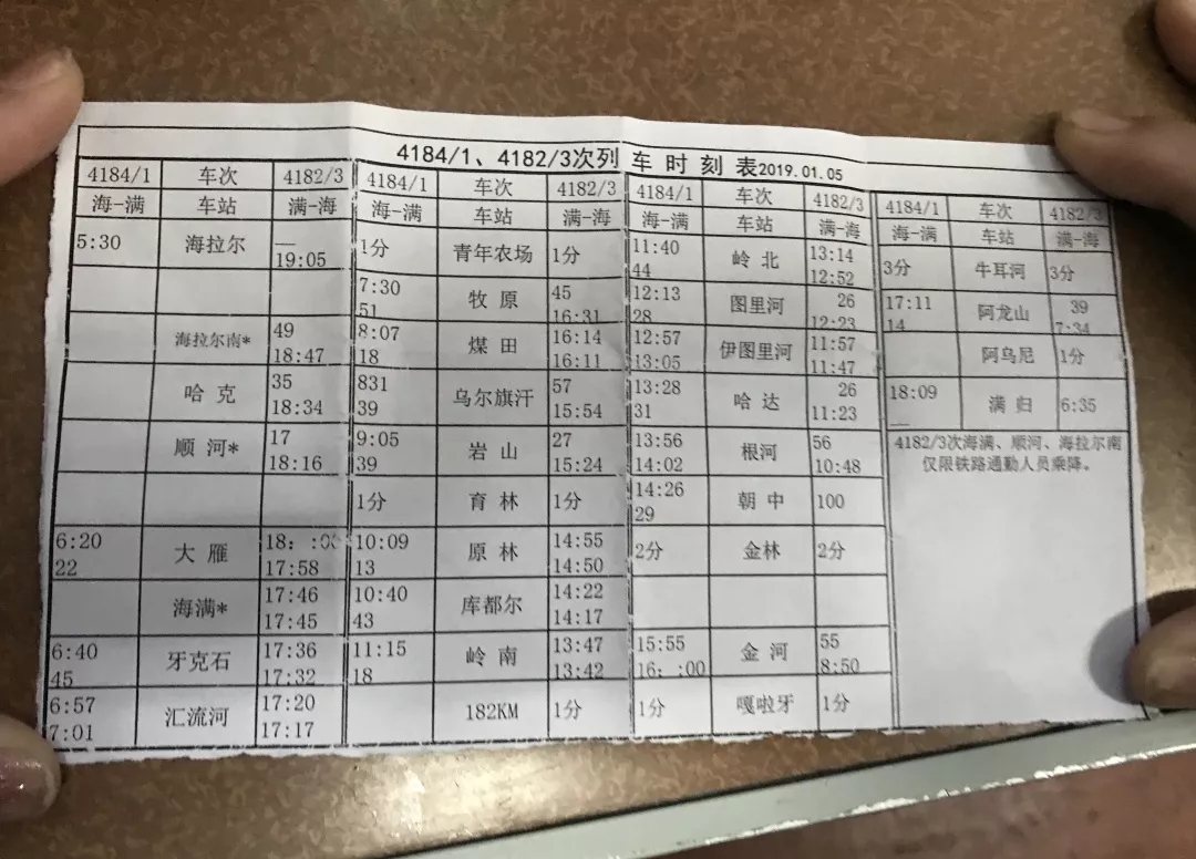4182次列車運(yùn)行在大興安嶺西北坡,全程523公里,一共31站,運(yùn)行時間12個半小時。有一些站在時刻表上是沒有的,也買不到票,得上車補(bǔ)票,三分之一是乘降點,沒有站臺,沒有工作人員。