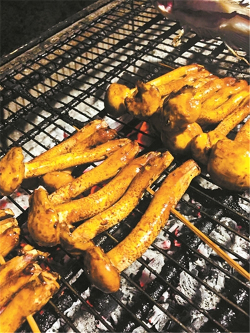 (3)將串好的虎松茸放炭火上烤十分鐘左右,其間抹上植物油、蠔油、蜜糖;