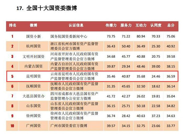 昆明信息港訊 記者叢林 1月22日,由人民日報主辦、微博和新浪網承辦的2019政務V影響力峰會在北京舉行,600余名來自中央部委和全國各地政務微博的優(yōu)秀代表、知名專家等出席了此次會議。會議發(fā)布《2018年度人民日報政務指數(shù)·微博影響力報告》,其中昆明市11個官方微博上榜,昆明市國資委官方微博“昆明國資”獲全國國資系統(tǒng)微博影響力第五名。