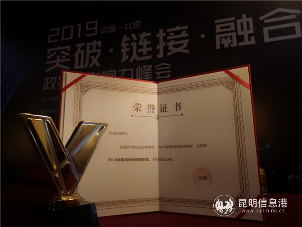 2019年政務(wù)V影響力峰會(huì)舉行 “@昆明發(fā)布”榮獲最佳矩陣案例獎(jiǎng)