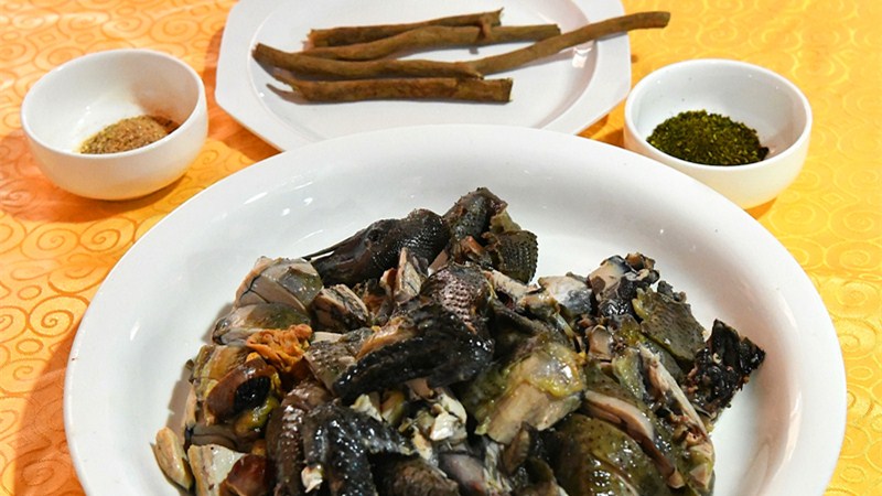香疙瘩,是當地生長的一種樹根,其學名叫山雞椒又名木香子、木姜子,在做菜時當做調料味道獨特,口感清涼微辛,有開胃健脾的功效。香疙瘩雞是將整只洗凈的雞放入鍋中加入適量糯米和油鹽煮透,撈出瀝干后切塊,再將香疙瘩舂成粉拌入雞肉。雞肉嚼在嘴里,鮮嫩、松軟、香甜,味道噴香四溢,是一道彝族風味美食。