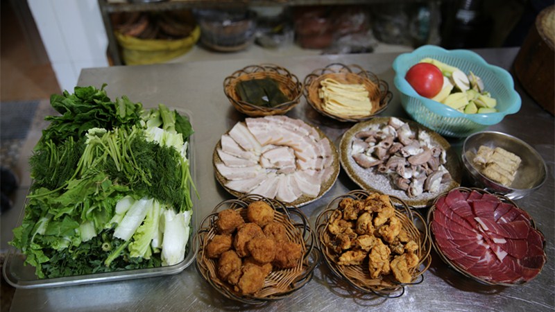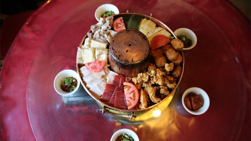 牟定縣共和鎮(zhèn)北塔村手工特制的銅鍋,是燒煮、盛放牟定銅炊鍋菜的唯一器具,鍋體中端留足放進木炭、明火燃料的空間,邊沿一圈入煮葷素菜品。菜品中均有牟定豆腐,搭配其間的還有洋芋塊、茨菇、海帶、木耳等素菜;肉類則挑選上好火腿瘦肉、粉腸、煮熟的五花鮮肉、酥肉、脆豬皮等。牟定銅炊鍋菜有其獨特的入菜程序,先放洋芋茨菇等素食綠菜,再用肉品覆蓋其上,最終加入事先備好的特制底湯,經銅鍋中心往外傳熱慢煮而成。