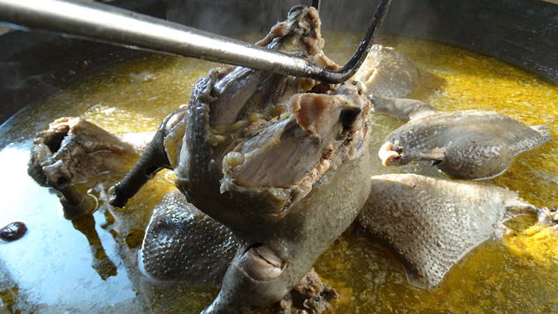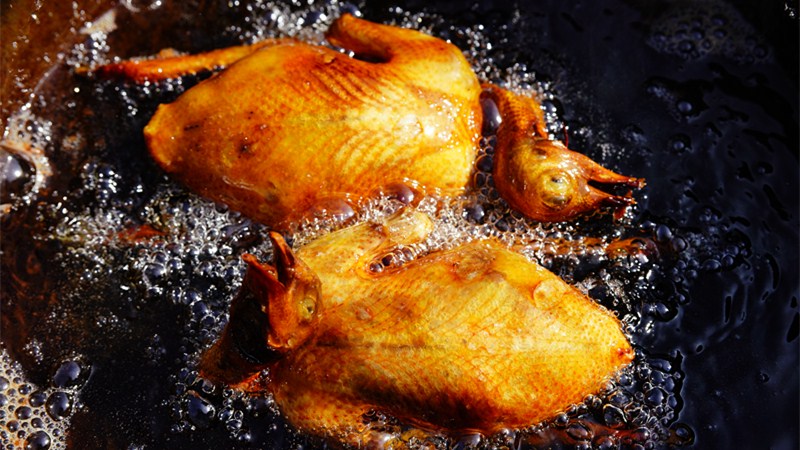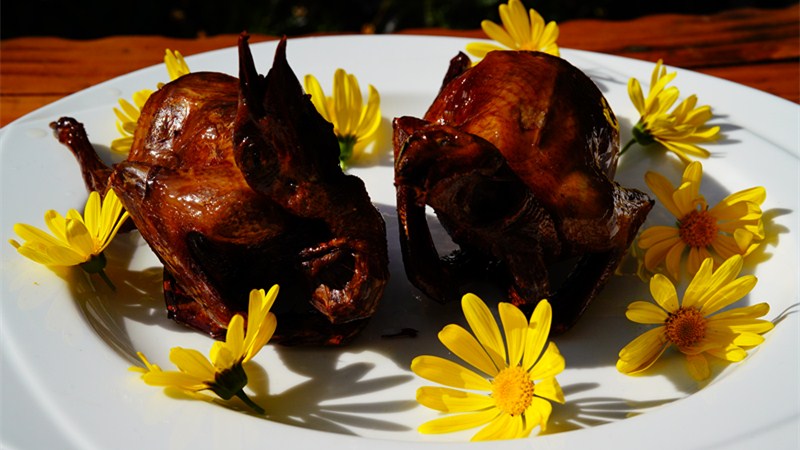 姚安乳鴿專挑未滿月的小鴿子烹飪成色香味美的佳肴。其肉質嫩骨酥,不肥不膩,既是席上珍肴,又是滋補佳品。油炸乳鴿取孵化滿20天的乳鴿去毛,去內臟洗凈,晾干水分后加食鹽、醬油、花椒、洋蔥絲攪拌勻,腌制兩小時,再放入翻滾的秘制鹵汁中小火慢煮兩小時以上,待油溫燒至六成熱,入鍋炸熟即可。色澤金黃、外焦里嫩、油而不膩的油炸乳鴿只需看上一眼,就讓人垂涎三尺。