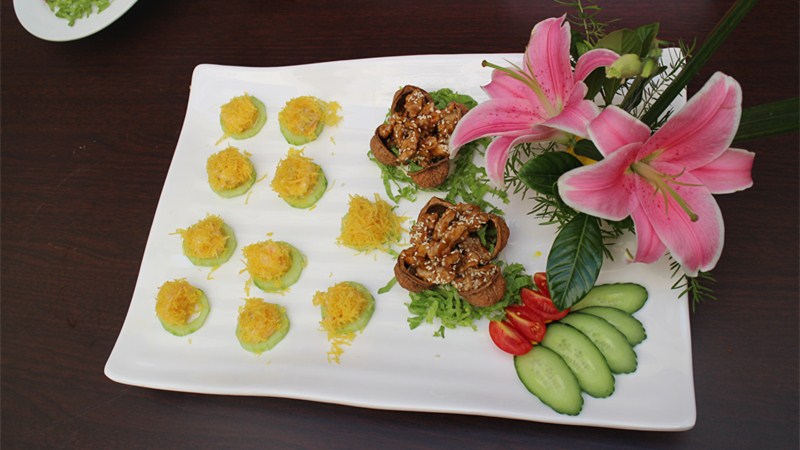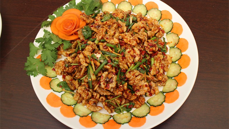 大姚千百年來祖祖輩輩種植核桃,核桃成為了大姚人飯桌上不可或缺的食材。尋著這味珍貴食材,心靈手巧的大姚人懷著對核桃的理解,創(chuàng)造了不少核桃美食。用核桃仁、松茸、竹蓀、土雞和豬手燉一鍋湯,就是一道“喜相逢”;鮮嫩可口的核桃豆腐則是婦女兒童的最愛,桃仁炒雞丁、鮮蝦爆桃仁,還有酸辣可口的核桃仁拌木耳都是飯桌上的“熟面孔”,是大姚人最喜愛的家常菜。