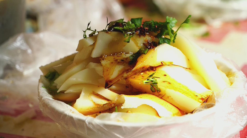 在宜就,石磨涼粉本身就是一道獨特的風景。街頭巷尾,叫賣石磨涼粉的吆喝聲此起彼伏,吃涼粉的人絡繹不絕。宜就石磨涼粉軟滑有韌勁,加上蔥段蒜末,配上獨特的麻辣鮮香作料和宜就梨醋,酸酸甜甜、涼爽可口、開胃健脾,是一道不可多得的美味小吃。