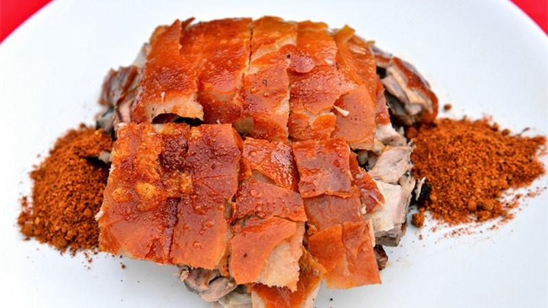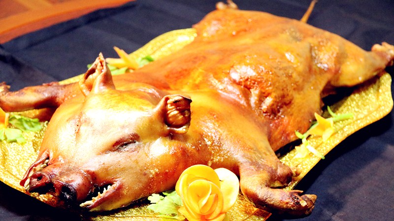烤乳豬是元謀一道極具地方風味的傳統(tǒng)佳肴,以當地二月齡或三月齡豬仔為主要原料。宰殺后,去其肚雜,刮凈豬毛,涂上香料、香油,以通桿由豬股部刺入,由眼部穿出,置于燒旺的炭火上烘烤,邊烘烤邊翻弄邊涂抹丁香、肉桂等佐料,直至皮色呈黃色時為止??臼斓男∝i色同琥珀,又類真金,入口則消,壯若凌雪,含漿膏潤,是款待親朋的必備佳肴,在餐飲業(yè)中久盛不衰,深受食客青睞。1961年陳毅同志在楚雄接待緬甸吳努總理時,曾作為席上佳品。