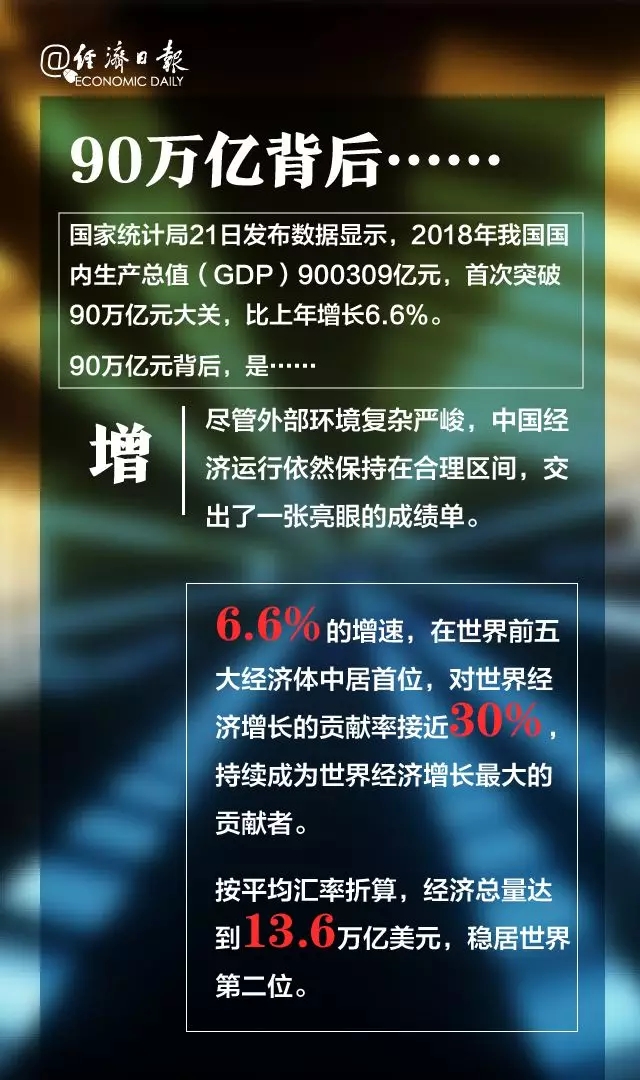 國家統(tǒng)計局21日發(fā)布數(shù)據(jù)顯示,2018年我國國內(nèi)生產(chǎn)總值(GDP)900309億元,首次突破90萬億元大關(guān),比上年增長6.6%。