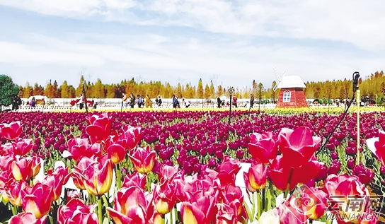 春節(jié)期間,撈漁河濕地公園姹紫嫣紅、蜂飛蝶舞,市民置身于浪漫、美麗的郁金香勝境,或別有一番韻味。(云南網(wǎng) 記者孫琴霞 實(shí)習(xí)生彭婷婷)