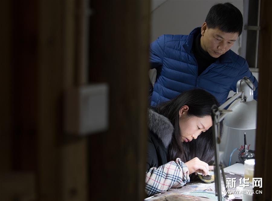 在龍泉市牛頭嶺村“七分醉”工作室,吳榮強(左)指導一名徒弟進行漆繕。