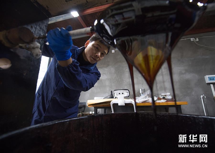吳榮強在龍泉市牛頭嶺村“七分醉”工作室精制大漆
