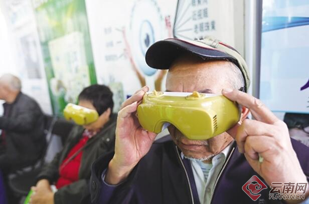 在去年12月舉行的昆明大健康產(chǎn)業(yè)博覽會上,老人體驗(yàn)艾灸治療眼睛。 記者楊崢/攝