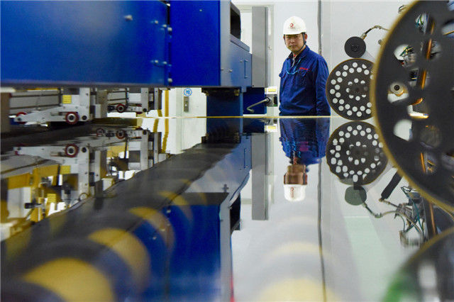 ↑1月9日,在中建材蚌埠玻璃工業(yè)設(shè)計(jì)研究院的生產(chǎn)車間內(nèi),工作人員在巡檢超薄玻璃生產(chǎn)線。新華社記者 湯陽 攝