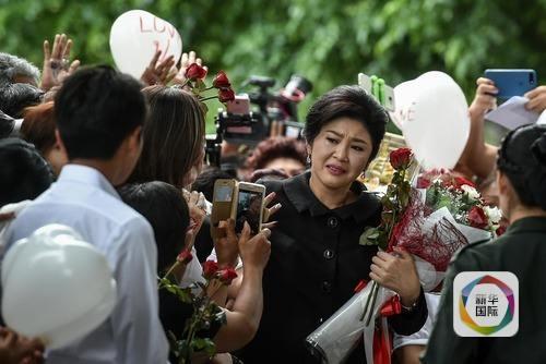 2017年7月21日,在位于曼谷的泰國最高法院外,泰國前總理英拉(中)在支持者面前流淚。(新華社記者李芒茫/攝)
