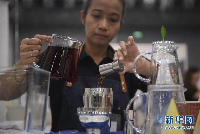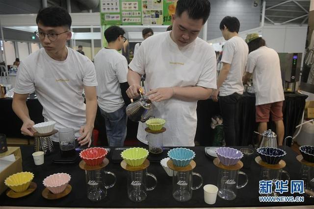1月25日,參展者在新加坡展覽中心舉行的傳統(tǒng)咖啡、茶與小吃展上示范泡咖啡。新華社發(fā) (鄧智煒/攝)
