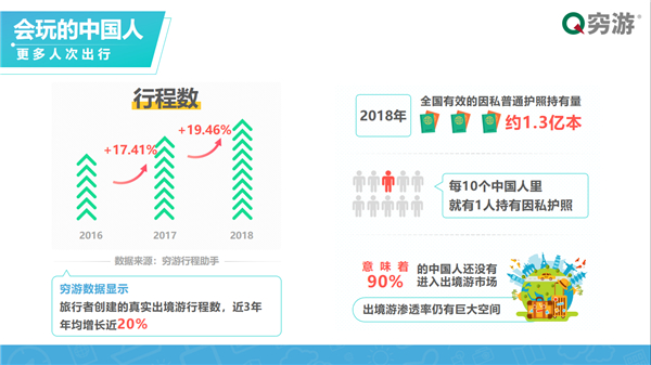 《報告》顯示,截止到2018年,全國有效的因私普通護照持有量達到了1.3億本。換言之,90%的中國人還未進入出境游市場,整體出境游滲透率仍擁有巨大空間。