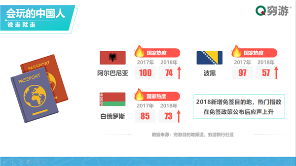 同時,小眾目的地的崛起也受簽證政策的影響。2018新增免簽?zāi)康牡厝绨柊湍醽啞⒉ê?、白俄羅斯等,其目的地?zé)衢T指數(shù)也在免簽政策公布后應(yīng)聲上升。