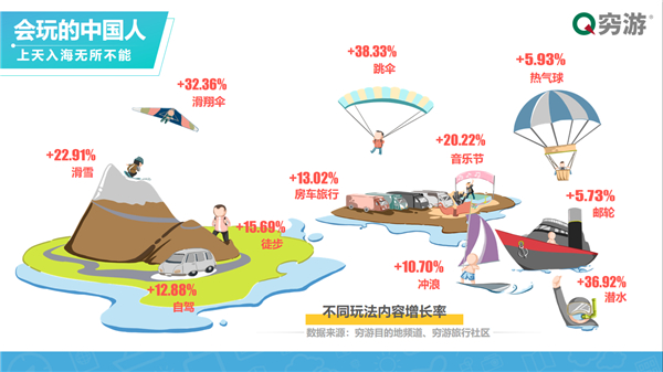 除了目的地選擇偏向小眾以外,國人出境游的玩法與形式也更加多樣,上天入海無所不能。最受旅行者熱捧的玩法包括跳傘、滑翔傘、潛水等在窮游平臺的內(nèi)容增長率都超過30%,滑雪、音樂節(jié)、徒步、房車旅行、沖浪、自駕等玩法也越來越受旅行者追捧。