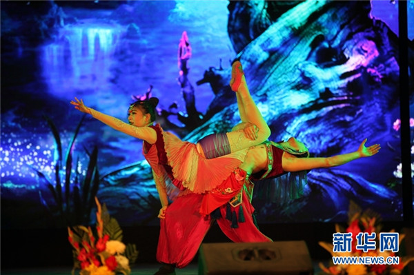 1月27日,在尼泊爾加德滿都市中心的尼軍俱樂部?jī)?nèi),魅力文旅發(fā)展有限公司的演員在表演舞蹈《激情合攏宴》脫。當(dāng)天,尼泊爾中國文化中心和中國湖南省文化和旅游廳聯(lián)合主辦“歡樂春節(jié)·錦繡瀟湘”為主題的演出,吸引了數(shù)百人前來觀看,反響熱烈。 新華社 記者周盛平/攝