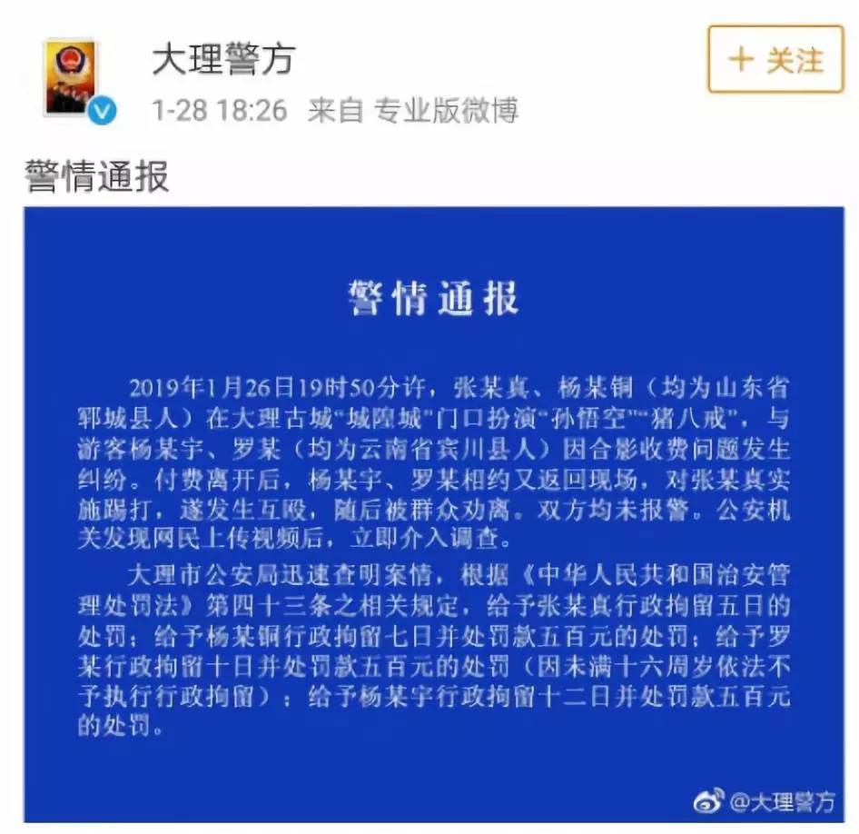 根據(jù)通報(bào)顯示:2019年1月26日19時(shí)50分許,張某真、楊某銅(均為山東省鄆城縣人)在大理古城“城隍城”門口扮演“孫悟空豬八戒”,與游客楊某宇、羅某(均為云南省賓川縣人)因合影收費(fèi)問題發(fā)生糾紛。付費(fèi)離開后,楊某宇、羅某相約又返回現(xiàn)場,對張某真實(shí)施踢打,遂發(fā)生互毆,隨后被群眾勸離。雙方均未報(bào)警。