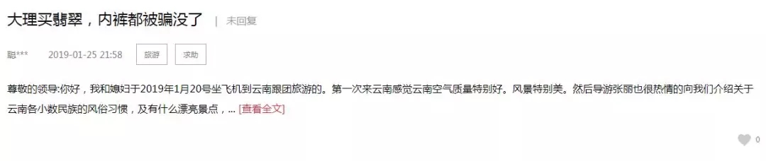 2019年1月25日,網(wǎng)友馮先生在人民網(wǎng)給云南省省委書記留言稱:“大理買翡翠,內(nèi)褲都被騙沒了”。