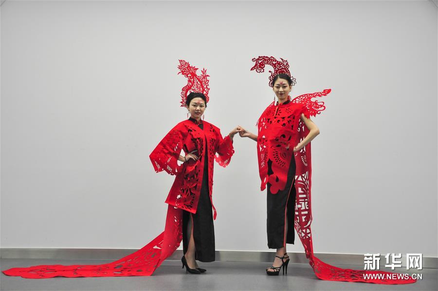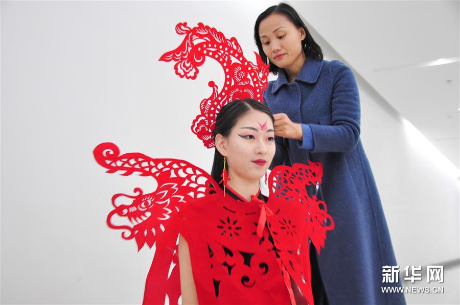 新春臨近,山東聊城民間藝人梁穎將傳統(tǒng)剪紙應(yīng)用在服飾設(shè)計(jì)上,利用植絨布、銅絲和膠水等制作了18套剪紙?jiān)煨偷姆?。中國傳統(tǒng)剪紙藝術(shù)與服飾的結(jié)合令人耳目一新。(新華社發(fā) 許文豪/ 攝)
