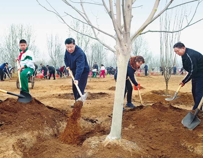 2018年4月2日,黨和國(guó)家領(lǐng)導(dǎo)人習(xí)近平、李克強(qiáng)、栗戰(zhàn)書、汪洋、王滬寧、趙樂際、韓正、王岐山等來到北京市通州區(qū)張家灣鎮(zhèn)參加首都義務(wù)植樹活動(dòng)。這是習(xí)近平同大家一起植樹。 新華社記者 謝環(huán)馳/攝