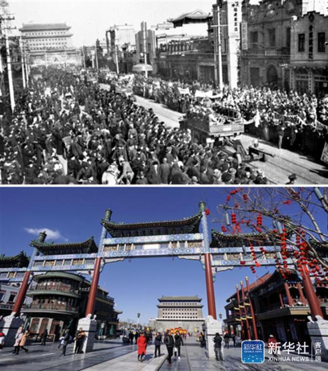 ↑這是一張拼版照片。上圖:1949年1月31日北平和平解放后,中國(guó)人民解放軍于2月3日舉行了入城式。這是北平市民在正陽(yáng)門大街上夾道歡迎參加入城式的人民解放軍(資料照片);下圖:2018年2月25日,游客在北京前門大街步行街參觀游覽(新華社記者李欣/攝)。