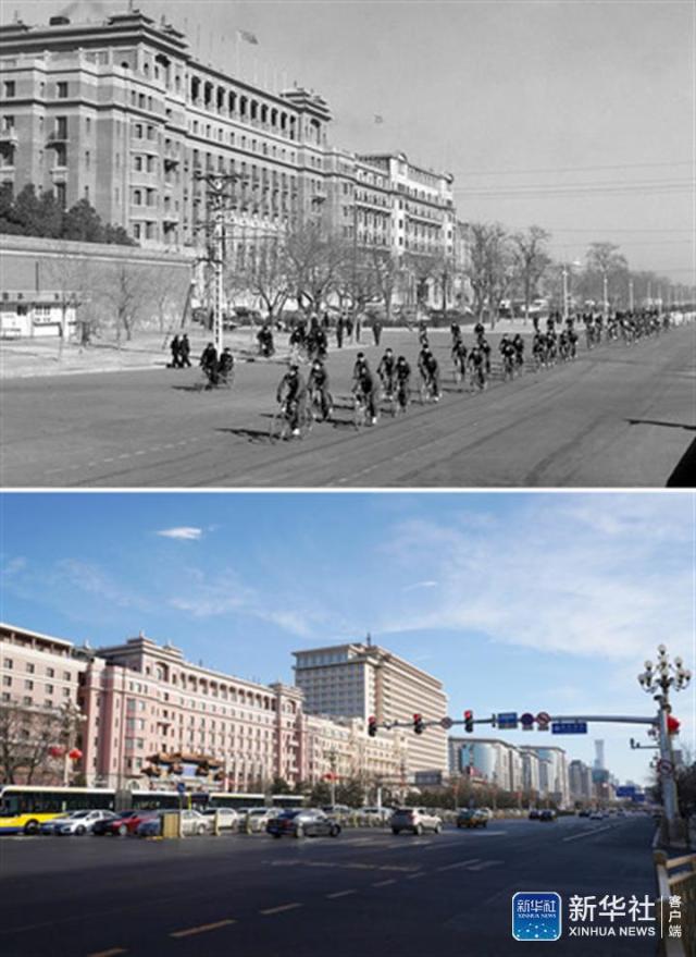 ↑這是一張拼版照片。上圖為1956年2月15日,北京、天津、唐山、保定、石家莊、張家口青年自行車比賽在北京舉行。這是比賽結(jié)束后,青年們騎車經(jīng)過(guò)東長(zhǎng)安街(新華社記者孟慶彪/攝);下圖為2019年1月28日,汽車行駛在東長(zhǎng)安街上(新華社記者鞠煥宗/攝)。