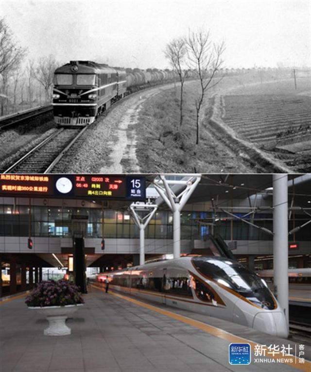 ↑拼版照片:上圖為1971年,北京二七機(jī)車車輛工廠試制的六千馬力液力傳動(dòng)內(nèi)燃機(jī)車在鐵路線上進(jìn)行試驗(yàn)(新華社記者周雙六/攝,資料照片);下圖為2018年8月8日,一列復(fù)興號(hào)動(dòng)車組列車抵達(dá)天津站。2018年8月8日,京津城際鐵路實(shí)施新的列車運(yùn)行圖,復(fù)興號(hào)動(dòng)車組按350公里時(shí)速運(yùn)行(新華社記者張晨霖/攝)。