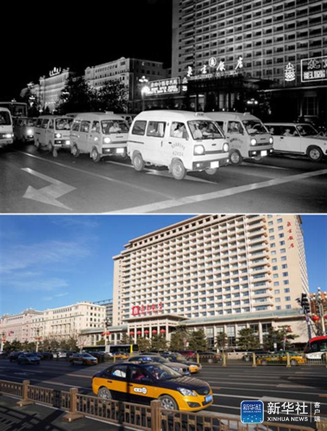↑拼版照片:上圖為1993年,幾輛出租車“面的”從北京飯店前駛過(guò)(資料照片);下圖為2019年1月28日,車輛從北京飯店前駛過(guò)(新華社記者鞠煥宗/攝)。