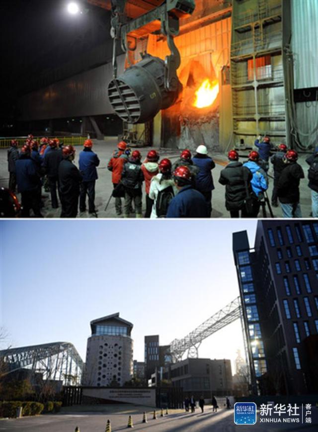 ↑這是一張拼版照片。上圖為2010年12月19日,媒體記者和首鋼職工在首鋼第二煉鋼廠共同見證最后一爐鋼冶煉的情景(新華社記者羅曉光/攝);下圖為2019年1月23日拍攝的位于新首鋼高端產(chǎn)業(yè)綜合服務(wù)區(qū)的北京2022年冬奧會(huì)組織委員會(huì)辦公地點(diǎn)(新華社記者鞠煥宗/攝)。