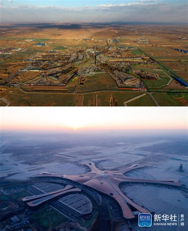 ↑拼版照片:上圖為2017年2月25日拍攝的北京新機(jī)場(chǎng)建設(shè)工地(新華社記者羅曉光/攝);下圖為2018年12月29日拍攝的主航站樓外立面裝修工程全面完成的北京大興國(guó)際機(jī)場(chǎng)(新華社記者鞠煥宗/攝)。