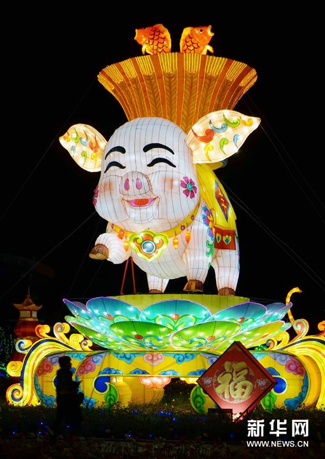1月30日,人們在貴州省仁懷市市民休閑廣場觀看生肖豬彩燈。新華社發(fā) 陳勇/攝