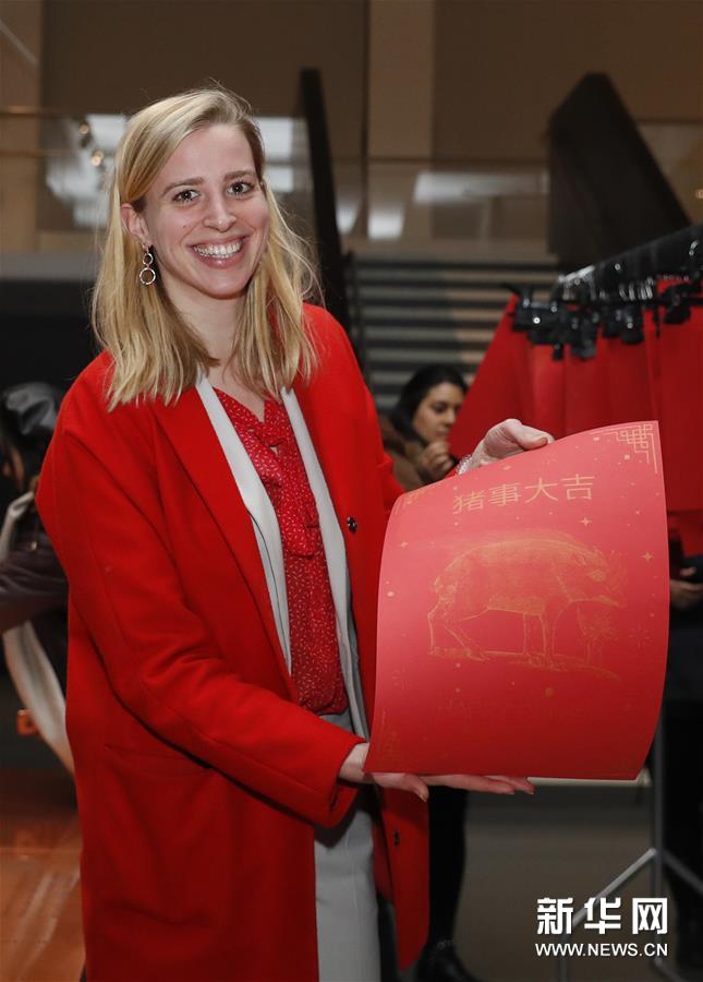 1月30日,在英國(guó)倫敦的科學(xué)博物館,一名參觀者展示親手制作的迎春招貼畫。新華社記者韓巖/攝