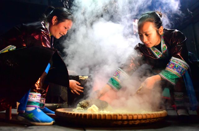 在廣西融水苗族自治縣桿洞鄉(xiāng)花孖村,苗族婦女石妹英(左)把蒸好的糯米飯倒放到篩箕里,準(zhǔn)備放入酒藥。