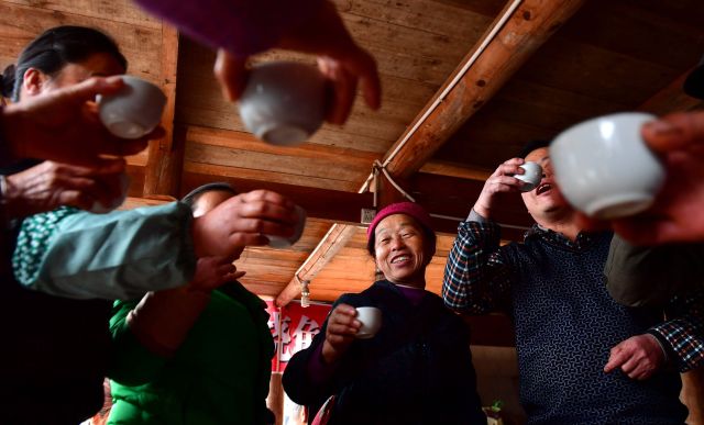 在廣西融水苗族自治縣桿洞鄉(xiāng)花孖村,苗族群眾在聚會(huì)中喝重陽酒。